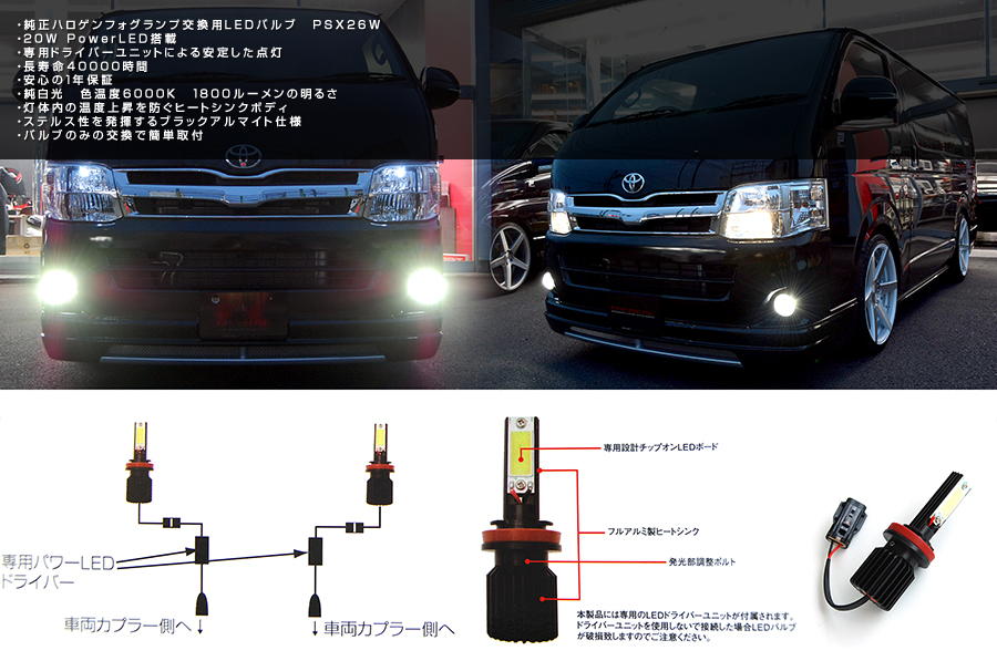 PSX26W 20W PowerLED搭載。専用ドライバーユニットによる安定した点灯。 長寿命40000時間。安心の1年保証。 純白光 色温度6000K 1800ルーメンの明るさ。灯体内の温度上昇を防ぐヒートシンクボディ。 ステルス性を発揮するブラックアルマイト仕様。バルブのみの交換で簡単取付。
